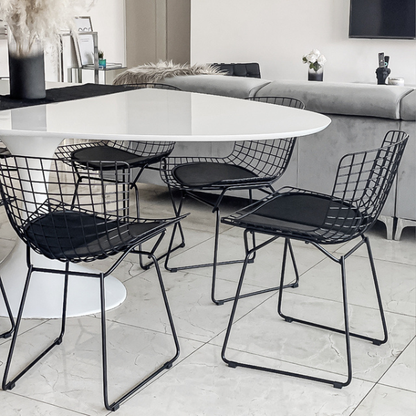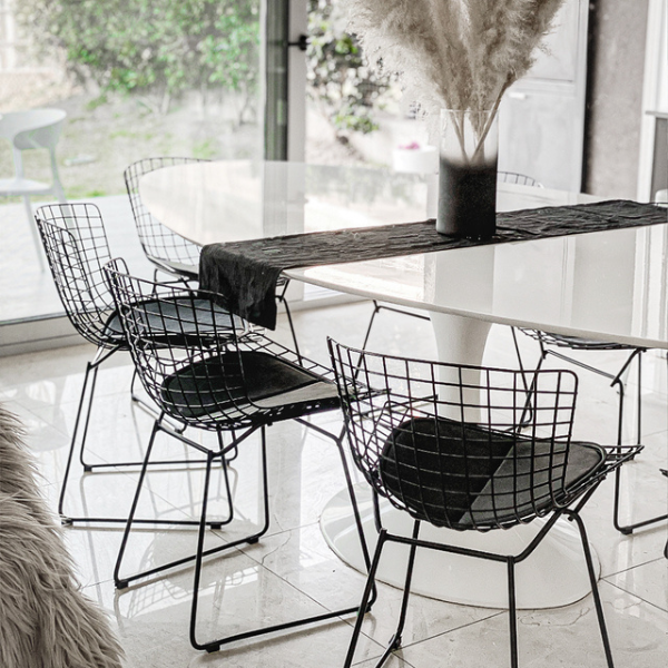En conclusión, nuestro modelo de Silla Bertoia, puede convivir tranquilamente con infinidad de mesas y estilos posibles, por ejemplo: deco industrial, vintage, moderno, entre otros.